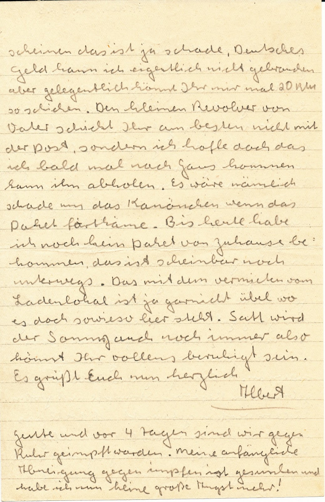 Habe heute das erste Päckchen mit dem Wörterbuch und Kuchen erhalten und habe mich sehr gefreut. Ich bin nun wenigstens beruhigt das es nicht fortgekommen ist. Dann könnt Ihr mir auch den kleinen Revolver schicken mit Munition - Lederetui und die Tasche für ans Koppel zu machen. Aber möglichst bald sonst dauert es zulange. Nun grüßt Euch bis auf weiteres Euer